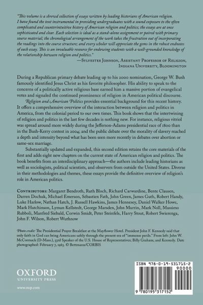 How do religion and politics interact in America? How has that relationship changed over time? Why have American religious and political thought sometimes developed along a parallell course while at other times they have moved in opposite directions? These are among the many important and fascinating questions addressed in this volume. Originally published in 1990 as Religion and American Politics: From The Colonial Period to the 1980s (4921 paperback copies sold), this book offers the first comprehensive survey of the relationship between religion and politics in America. It features a stellar lineup of scholars, including Richard Carwardine, Nathan Hatch, Daniel Walker Howe, George Marsden, Martin Marty, Harry Stout, John Wilson, Robert Wuthnow, and Bertram Wyatt-Brown. Since its publication, the influence of religion on American politics--and, therefore, interest in the topic--has grown exponentially. For this new edition, Mark Noll and new co-editor Luke Harlow offer a completely new introduction, and also commission several new pieces and eliminate several that are now out of date. The resulting book offers a historically-grounded approach to one of the most divisive issues of our time, and serves a wide variety of courses in religious studies, history, and politics.