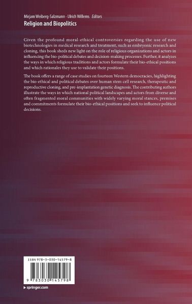 Introduction: Challenging the Political - Religious Actors and Religious Arguments in Liberal Democracies (Mirjam Weiberg-Salzmann and Ulrich Willems).- Part I: Catholic-Latin states with low level or little religious pluralism.- Discursive Strategies of Catholic Churches in Assisted Reproduction Technology Regulation: Poland and Spain in Comparison (Anja Hennig).- The Role of Religion in Debates on Embryo Research and Surrogacy in France (Jennifer Merchant).- Embryonic Silences: Human Life Between Biomedicine, Religion, and State Authorities in Austria (Ingrid Metzler and Anna Pichelstorfer).- Religion and Biopolitics in Ireland (Mirjam Weiberg-Salzmann).- Part II: Protestant(-English) states with high or moderate level religious pluralism.- Biotechnology and the Non-religious Uses of God Talk (John H. Evans).- The Political Debate on Embryo Research in New Zealand and the Role of Religious Actors and Arguments (David Gareth Jones).- The Political Debate on Embryo Research in Australia and the Role of Religious Actors and Arguments (Frank O'Keeffe and Kevin McGovern).- Part III: Protestant(-Scandinavian) states with low level religious pluralism.- The Status of the Human Embryo: A Case Study of Embryo Experiments and Embryo Research in Denmark (Jacob Dahl Rendtorff).- Religion and Biopolitics in Sweden (Göran Hermerén and Mats Johansson).- Negotiating Embryo Politics in Norway and Italy (Mirjam Weiberg-Salzmann and Massimiliano Passerini).- Part IV: Mixed-confession states with high level religious pluralism.- The Role of Religion in the Political Debate on Embryo Research in the Netherlands (Wybo J. Dondorp and Guido M. W. R. de Wert).- Moralizing Embryo Politics in Germany (Mirjam Weiberg-Salzmann).- Bioethics and Biopolitics in Switzerland: Stem Cell Research and Pre-Implantation Diagnostics in the Public Discourse (Monika Bobbert and Yvonne Zelter).- Morality Policies: How Religion and Politics Interplayin Democratic Decision-making in Belgium (Nathalie Schiffino).-