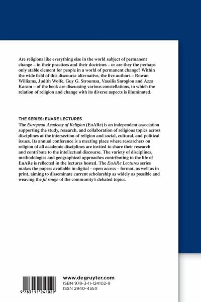 Are religions like everything else in the world subject of permanent change - in their practices and their doctrines - or are they the perhaps only stable element for people in a world of permanent change? Within the wide field of this discourse alternative, the five authors - Rowan Williams, Judith Wolfe, Guy G. Stroumsa, Vassilis Saroglou and Azza Karam - of the book are discussing various constellations, in which the relation of religion and change with its diverse aspects is illuminated.