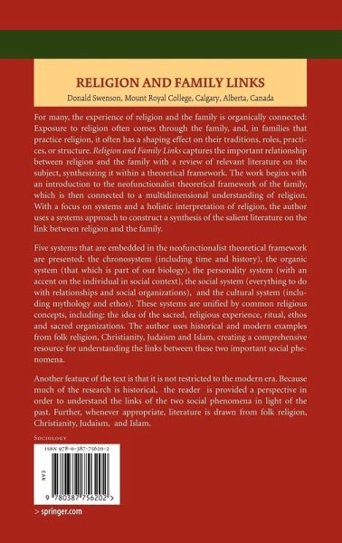 For many, the experience of religion and the family are organically connected: first exposure to religion often comes through the family, and, in families that practice a religion, it often has a shaping effect on their traditions, roles, practices, or structure. The author of this text captures the important relationship between religion and the family with a review of relevant literature on the subject, synthesizing it within a theoretical framework. The work begins with an introduction to the neofunctionalist theoretical framework of the family. This framework is connected to a multidimensional understanding of religion. With a focus on systems and a holistic interpretation of religion, the author uses a systems approach to construct a synthesis of the salient literature on the link between religion and the family.