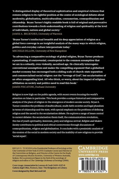 'A distinguished display of theoretical sophistication and empirical richness that restores religion to its rightful position at the centre of sociological debates about modernity, globalization, multiculturalism, consumerism, cosmopolitanism and citizenship. Bryan Turner's highly readable book is full of original and provocative contributions towards a fresh understanding of religion and spirituality at the level of individuals, nations and global society.' James A. Beckford, University of Warwick