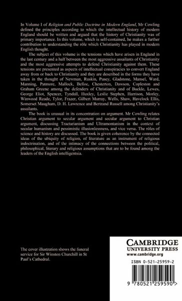 In Volume 1 of Religion and Public Doctrine in Modern England, Maurice Cowling defined the principles according to which the intellectual history of modern England should be written and argued that the history of Christianity was of primary importance. In this volume, which is self-contained, he makes a further contribution to understanding the role which Christianity has played in modern English thought. The book is unusual in its concentration on argument. Cowling relates Christian argument to secular argument and secular argument to Christian argument, discussing Tractarianism and Ultramontanism in the context of secular humanism and pessimistic illusionlessness, and vice versa. The roles of science and history are discussed. The book is given coherence by the connected ideas of the ubiquity of religion, of literature as an instrument of religious indoctrination, and of the intimacy of the connections between the political, philosophical, literary and religious assumptions that are to be found among the leaders of the English intelligentsia.