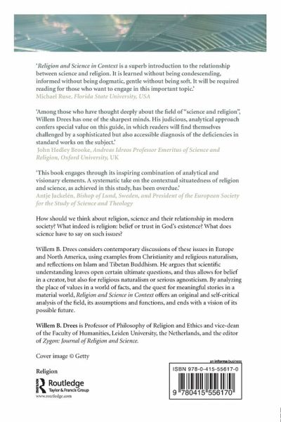 How should we think about religion, science, and their relationship in modern society? Some religious groups oppose evolution; some atheists claim science is on their side. Others reconcile their beliefs with science, or consider science and faith to deal with fundamentally different aspects of human life. What indeed is religion: belief or trust in God's existence? How do we distinguish sense from superstition? What does science have to say on such issues? Willem B. Drees considers contemporary discussions of these issues in Europe and North America, using examples from Christianity and religious naturalism, and reflections on Islam and Tibetan Buddhism. He argues that the scientific understanding leaves open certain ultimate questions, and thus allows for belief in a creator, but also for religious naturalism or serious agnosticism. By analysing the place of values in a world of facts, and the quest for meaningful stories in a material world, Religion and Science in Context offers an original and self-critical analysis of the field, its assumptions and functions, and ends with a vision of its possible future.
