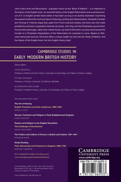 John Foxe's Acts and Monuments - popularly known as the 'Book of Martyrs' - is a milestone in the history of the English book. An essential history of the English Reformation and a seminal product of it, no English printed book before it had been as long or as lavishly illustrated. Examining the research behind the work and also its financing, printing and dissemination, Elizabeth Evenden and Thomas S. Freeman argue that, apart from Foxe's zeal and industry, the book was only made possible by extensive cooperation between its printer, John Day, and the Elizabethan government. Government patronage, rather than market forces, lay behind the book's success and ensured the triumph of a Protestant interpretation of the Reformation for centuries to come. Based on little-used manuscript sources, this book offers a unique insight not only into the 'Book of Martyrs' and the history of the English book, but into English history itself.