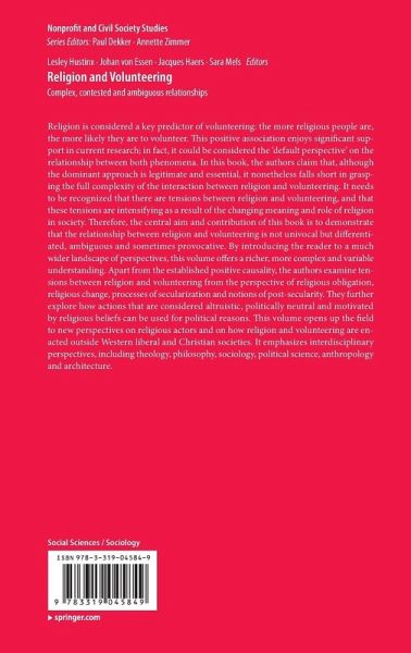 Religion is considered a key predictor of volunteering: the more religious people are, the more likely they are to volunteer. This positive association enjoys significant support in current research; in fact, it could be considered the 'default perspective' on the relationship between both phenomena. In this book, the authors claim that, although the dominant approach is legitimate and essential, it nonetheless falls short in grasping the full complexity of the interaction between religion and volunteering. It needs to be recognized that there are tensions between religion and volunteering, and that these tensions are intensifying as a result of the changing meaning and role of religion in society. Therefore, the central aim and contribution of this book is to demonstrate that the relationship between religion and volunteering is not univocal but differentiated, ambiguous and sometimes provocative. By introducing the reader to a much wider landscape of perspectives, this volume offers a richer, more complex and variable understanding. Apart from the established positive causality, the authors examine tensions between religion and volunteering from the perspective of religious obligation, religious change, processes of secularization and notions of post-secularity. They further explore how actions that are considered altruistic, politically neutral and motivated by religious beliefs can be used for political reasons. This volume opens up the field to new perspectives on religious actors and on how religion and volunteering are enacted outside Western liberal and Christian societies. It emphasizes interdisciplinary perspectives, including theology, philosophy, sociology, political science, anthropology and architecture.