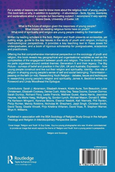 Introduction I: Generations and their Legacy 1: The Expressive Communalism of Post-Boomer Religion in the USA 1 2: Religion, Pop Culture and 'Virtual Faith' 3: Explaining Change over Time in Religious Involvement 4: 'Generation X' Religion: A Critical Evaluation II: The Big Picture: Surveys of Belief and Practice 5: On 'Moralistic Therapeutic Deism' as US Teenagers' Actual, Tacit, De Facto Religious Faith 6: The Teenage Religion and Values Survey in England and Wales 7: The Spirituality of Young Australians III: Expression 8: What Spirituality Means to Young Adults 9: Shamanic Practices and Social Capital among Native Youths in the Brazilian Amazon 10: Teenage Witchcraft in Britain 11: Exploring Symbolic, Emotional and Spiritual Expression amongst 'Crasher Clubbers' 12: 'Believing in Belonging': An Exploration of Young People's Social Contexts and Constructions of Belief 13: The Role of Religion in the Sexual Lives of Teens IV: Identity 14: Islamic Revival and Young Women's Negotiations on Gender and Racism 15: Engaging with Teenage Girls' Understandings of Religion and Gender 16: British Sikh Youth: Identity, Hair and the Turban 17: 'A Place to Grow Spiritually and Socially': The Experiences of Young Pilgrims to Lourdes 18: Religious Socialisation and a Reflexive Habitus: Christian Youth Groups as Sites for Identity Work V: Transmission 19: The Role of Families and Religious Institutions in Transmitting Faith among Christians, Muslims, and Hindus in the USA 20: Growing Up in a Mixed-Faith Family: Intact or Fractured Chain of Memory? 1 21: Socialisation and Spiritual Capital: What Difference do Clergy Families Make? 22: Protestant Confirmation in European Perspective VI: Researching Youth Religion 23: A Question of Belief 24: Quantitative Methods 25: Visual Methods 26: Gender Matters: Doing Feminist Research on Religion and Youth 27: Insider-Desire: Coveting Insider Status and Its Consequences Conclusion Epilogue