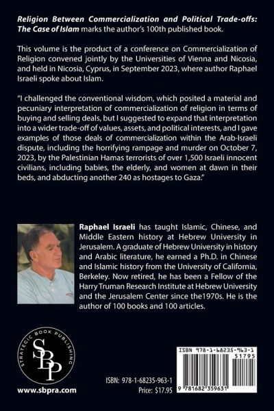 Religion Between Commercialization and Political Trade-offs: The Case of Islam marks the author's 100th published book. This volume is the product of a conference on Commercialization of Religion convened jointly by the Universities of Vienna and Nicosia, and held in Nicosia, Cyprus, in September 2023, where author Raphael Israeli spoke about Islam. "I challenged the conventional wisdom, which posited a material and pecuniary interpretation of commercialization of religion in terms of buying and selling deals, but I suggested to expand that interpretation into a wider trade-off of values, assets, and political interests, and I gave examples of those deals of commercialization within the Arab-Israeli dispute, including the horrifying rampage and murder on October 7, 2023, by the Palestinian Hamas terrorists of over 1,500 Israeli innocent civilians, including babies, the elderly, and women at dawn in their beds, and abducting another 240 as hostages to Gaza." (About the Author) Raphael Israeli has taught Islamic, Chinese, and Middle Eastern history at Hebrew University in Jerusalem. A graduate of Hebrew University in history and Arabic literature, he earned a Ph.D. in Chinese and Islamic history from the University of California, Berkeley. Now retired, he has been a Fellow of the Harry Truman Research Institute at Hebrew University and the Jerusalem Center since the1970s. He is the author of 100 books and 100 articles.