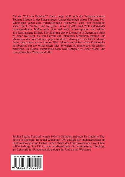 "Ist die Welt ein Problem?" Diese Frage stellt sich der Trappistenmönch Thomas Merton in der klausurierten Abgeschiedenheit seines Klosters. Sein Widerstand gegen eine weltentfremdete Klosterwelt wird zum Paradigma seiner Sicht von Welt und Religion. So wie Kloster und Welt miteinander korrespondieren, bilden auch Gott und Welt, Kontemplation und Aktion eine kontrastierte Einheit. Die Spaltung dieser Kontraste in Gegensätze führt zu einer Weltsicht, die mit Gewalt und totalitären Strukturen operiert. Als Menschen des Widerstands gegen totalitäre Ideologien beschreibt Merton Franz Jägerstätter sowie Simone Weil. Merton entwickelt einen Kontemplationsbegriff, der die Wirklichkeit alles Seienden als relationales Geschehen betrachtet. In diesem relationalen Sinn wird Religion zu einer Macht, die zum politischen Widerstand führt.