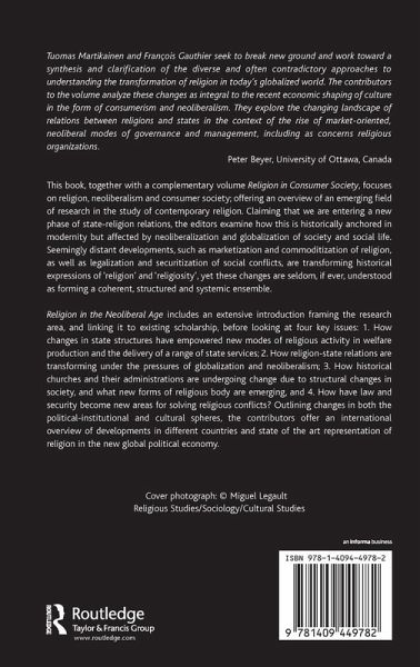 This book, together with the complementary volume Religion in Consumer Society, focuses on religion, neoliberalism and consumer society; offering an overview of an emerging field of research in the study of contemporary religion. Outlining changes in both the political-institutional and cultural spheres, the contributors offer an international overview of developments in different countries and state of the art representation of religion in the new global political economy.