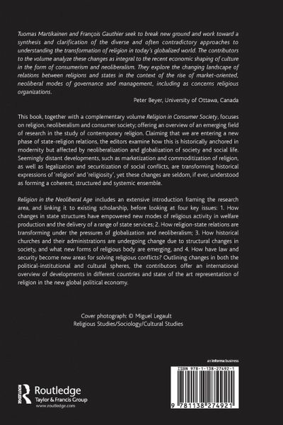 Contents: Preface; Introduction: religion in market society, François Gauthier, Tuomas Martikainen and Linda Woodhead; Part I Religions in the New Political Economy: Entrepreneurial spirituality and ecumenical alterglobalism: two religious responses to global neoliberalism, Joanildo A. Burity; Making religion irrelevant: the 'resurgent religion' narrative and the critique of neo-liberalism, James V. Spickard; The decline of the parishes and the rise of city churches: the German Evangelical Church in the age of neoliberalism, Jens Schlamelcher; Catholic Church civil society activism and the neoliberal government project of migrant integration in Ireland, Breda Gray; Faith, welfare, and the formation of the modern American Right, Jason Hackworth. Part II Political Governance of Religion: Neoliberalism and the privatization of welfare and religious organizations in the United States of America, David Ashley and Ryan Sandefer; Multilevel and pluricentric network governance of religion, Tuomas Martikainen; Regulating religion in a neoliberal context: the transformation of Estonia, Ringo Ringvee; Neoliberalism and counterterrorism laws: impact on Australian Muslim community organizations, Agnes Chong; From implicitly Christian to neoliberal: the moral foundations of Canadian law exposed by the case of prostitution, Rachel Chagnon and François Gauthier; Religious freedom and neoliberalism: from harm to cost-benefit, Lori G. Beaman; Bibliography; Index.
