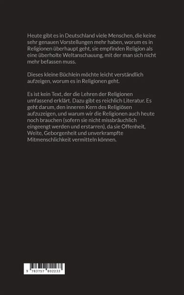 Heute gibt es in Deutschland viele Menschen, die keine sehr genauen Vorstellungen mehr haben, worum es in Religionen überhaupt geht, sie empfinden Religion als eine überholte Weltanschauung, mit der man sich nicht mehr befassen muss.Dieses kleine Büchlein möchte leicht verständlich aufzeigen, worum es in Religionen geht.Es ist kein Text, der die Lehren der Religionen umfassend erklärt. Dazu gibt es reichlich Literatur. Es geht darum, den inneren Kern des Religiösen aufzuzeigen, und warum wir die Religionen auch heute noch brauchen (sofern sie nicht missbräuchlich eingeengt werden und erstarren), da sie Offenheit, Weite, Geborgenheit und unverkrampfte Mitmenschlichkeit vermitteln können.