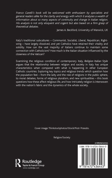 Italy's traditional subcultures - Communist, Socialist, Liberal, Republican, Right-wing - have largely dissolved and yet Catholics have retained their vitality and solidity. How can the vast majority of Italians continue to maintain some connection with Catholicism? How much is the Italian situation influenced by the closeness of the Vatican? Examining the religious condition of contemporary Italy, Religion Italian Style argues that the relationship between religion and society in Italy has unique characteristics when compared with what is happening in other European Catholic Countries. Exploring key topics and religious trends which question how the population feel - from the laity and the role of religions in the public sphere, to moral debates, forms of religious pluralism, and new spiritualities - this book questions how these affect religious life, and how intricately religion is interwoven with the nation's fabric and the dynamics of the whole society.