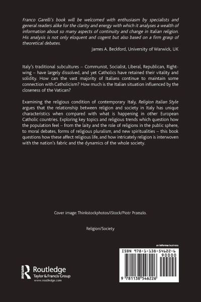Italy's traditional subcultures - Communist, Socialist, Liberal, Republican, Right-wing - have largely dissolved and yet Catholics have retained their vitality and solidity. How can the vast majority of Italians continue to maintain some connection with Catholicism? How much is the Italian situation influenced by the closeness of the Vatican? Examining the religious condition of contemporary Italy, Religion Italian Style argues that the relationship between religion and society in Italy has unique characteristics when compared with what is happening in other European Catholic Countries. Exploring key topics and religious trends which question how the population feel - from the laity and the role of religions in the public sphere, to moral debates, forms of religious pluralism, and new spiritualities - this book questions how these affect religious life, and how intricately religion is interwoven with the nation's fabric and the dynamics of the whole society.