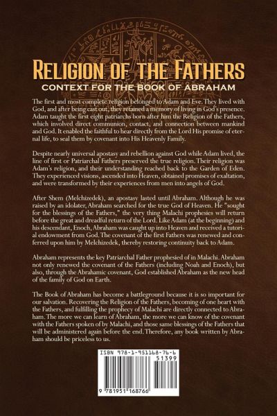 The first and most complete religion belonged to Adam and Eve. They lived with God, and after being cast out, they retained a memory of living in God's presence. Adam taught the first eight patriarchs born after him the Religion of the Fathers, which involved direct communion, contact, and connection between mankind and God. It enabled the faithful to hear directly from the Lord His promise of eternal life, to seal them by covenant into His Heavenly Family. Despite nearly universal apostasy and rebellion against God while Adam lived, the line of first or Patriarchal Fathers preserved the true religion. Their religion was Adam's religion, and their understanding reached back to the Garden of Eden. They experienced visions, ascended into Heaven, obtained promises of exaltation, and were transformed by their experiences from men into angels of God. After Shem (Melchizedek), an apostasy lasted until Abraham. Although he was raised by an idolater, Abraham searched for the true God of Heaven. He "sought for the blessings of the Fathers," the very thing Malachi prophesies will return before the great and dreadful return of the Lord. Like Adam (at the beginning) and his descendant, Enoch, Abraham was caught up into Heaven and received a tutorial endowment from God. The covenant of the first Fathers was renewed and conferred upon him by Melchizedek, thereby restoring continuity back to Adam. Abraham represents the key Patriarchal Father prophesied of in Malachi. Abraham not only renewed the covenant of the Fathers (including Noah and Enoch), but also, through the Abrahamic covenant, God established Abraham as the new head of the family of God on Earth. The Book of Abraham has become a battleground because it is so important for our salvation. Recovering the Religion of the Fathers, becoming of one heart with the Fathers, and fulfilling the prophecy of Malachi are directly connected to Abraham. The more we can learn of Abraham, the more we can know of the covenant with the Fathers spoken of by Malachi, and those same blessings of the Fathers that will be administered again before the end. We can, if faithful, obtain all that the original Fathers received from God at the beginning. Therefore, any book written by Abraham should be priceless to us. The Lord's "strange act" is approaching completion. The promises made to the Fathers are being vindicated. The Restoration has recommenced, and if we are faithful, it will not be paused or interrupted again. Although Israel's numbers are few, there have never been great numbers willing to sacrifice everything for God. The Religion of the Fathers presents a strong defense of the authenticity of the Book of Abraham as translated through Joseph Smith Jr. in 1835, and subsequently published in the Times & Seasons in 1842. It also presents an expanded view of the Restoration of the gospel, its ancient roots, current covenants, and prophesied future. Topics covered include Christianity, miracles, heaven, hell, the apocalypse, truth, the Bible, the devil, historical evidence, Lectures on Faith, the Ten Commandments, signs of the times, Teachings of the Prophet Joseph Smith, the law of consecration, the Joseph Smith Papers, Joseph's journal, the translation process, the destiny of the Christian church, polygamy, saving grace, and many more.