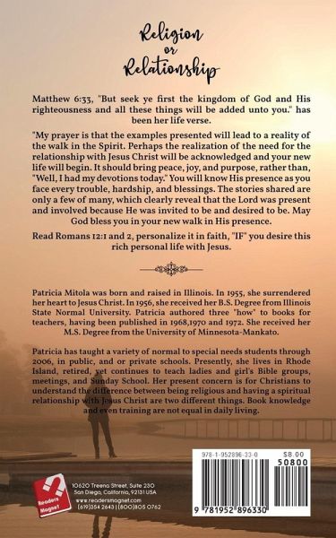 Matthew 6:33, "But seek ye first the kingdom of God and His righteousness and all these things will be added unto you." has been her life verse. "My prayer is that the examples presented will lead to a reality of the walk in the Spirit. Perhaps the realization of the need for the relationship with Jesus Christ will be acknowledged and your new life will begin. It should bring peace, joy, and purpose, rather than, "Well, I had my devotions today." You will know His presence as you face every trouble, hardship, and blessings. The stories shared are only a few of many, which clearly reveal that the Lord was present and involved because He was invited to be and desired to be. May God bless you in your new walk in His presence. Read Romans 12:1 and 2, personalize it in faith, "IF" you desire this rich personal life with Jesus.