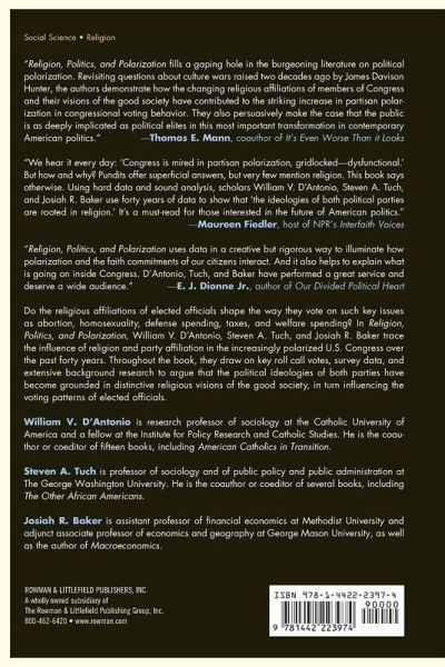 Do the religious affiliations of elected officials shape the way they vote on such key issues as abortion, homosexuality, defense spending, taxes, and welfare spending? In Religion, Politics, and Polarization: How Religiopolitical Conflict is Changing Congress and American Democracy,William D’Antonio, Steven A. Tuch and Josiah R. Baker trace the influence of religion and party in the U.S. Congress over time. For almost four decades these key issues have competed for public attention with health care, war, terrorism, and the growing inequity between the incomes of the middle classes and those of corporate America. The authors examine several contemporary issues and trace the increasing polarization in Congress. They examine whether abortion, defense and welfare spending, and taxes are uniquely polarizing or, rather, models of a more general pattern of increasing ideological division in the U.S. Congress. By examining the impact of religion on these key issues the authors effectively address the question of how the various religious denominations have shaped the House and Senate. Throughout the book they draw on key roll call votes, survey data, and extensive background research to argue that the political ideologies of both parties have become grounded in distinctive religious visions of the good society, in turn influencing the voting patterns of elected officials.