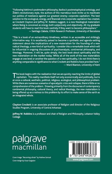 "Following Vattimo's postmodern philosophy, Badiou's postmetaphysical ontology, and i ek's revolutionary style, the authors of this marvelous book invites us to reactivate our politics of resistance against our greatest enemy: corporate capitalism. The best solution to the ecological, energy, and financial crisis corporate capitalism has created, as Crockett Clayton and Jeffrey Robbins suggest, is a new theological materialism where Being is conceived as energy both subjectively and objectively. All my graduate students will have to read this book carefully if they want to become philosophers." - Santiago Zabala, ICREA Research Professor at the University of Barcelona"This is a book of an extraordinary timeliness, written in an accessible and strikingly informative way. It is excellently poised to become a synthetic and agenda setting statement about the implications of a new materialism for the founding of a new radical theology, a new kind of spirituality. I consider this therefore quite a remarkable book which will be influential in ongoing discussions of psychoanalysis, continental philosophy, and theology. Moreover, it will be, quite simply, the best book about spirituality and the new materialism on the market today. While all of the work of the new materialists engage at one level or another the question of a new spirituality, I do not think there is anything comparable in significance to what Crockett and Robbins have provided here." - Ward Blanton, University of Kent"This book will perhaps be most appreciated by the reader with an intuitive cast of mind, able to recognize the force of an argument in its imaginative suggestiveness . . . New Materialism is about energy transformation, we are told, energy which cannot be reduced to matter because it resonates with spirit and life . . . Yet the book strikes a fundamental note of hard reality: 'if we want our civilization to live on earth a little longer we will have to recognize our coexistence with and in earth'." - Christian Ecology Link