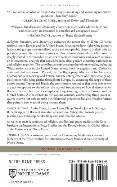 In this timely book, an interdisciplinary group of scholars investigates the recent resurfacing of White Christian nationalism and racism in populist movements across the globe. Religion, Populism, and Modernity examines the recent rise of White Christian nationalism in Europe and the United States, focusing on how right-wing populist leaders and groups have mobilized racist and xenophobic rhetoric in their bids for political power. As the contributors to this volume show, this mobilization is deeply rooted in the broader structures of western modernity and as such requires an intersectional analysis that considers race, gender, ethnicity, nationalism, and religion together. The contributors explore a number of case studies, including White nationalism in the United States among both evangelicals and Catholics, anti- and philosemitism in Poland, the Far Right party Alternative for Germany, Islamophobia in Norway and France, and the entanglement of climate change opposition in right-wing parties throughout Europe. By extending the scope of these essays beyond Trump and Brexit, the contributors remind us that these two events are not exceptions to the rule of the normal functioning of liberal democracies. Rather, they are in fact but recent examples of long-standing trends in Europe and the United States. As the editors to the volume contend, confronting these issues requires that we not only unearth their historical precedents but also imagine futures that point to new ways of being beyond them. Contributors: Atalia Omer, Joshua Lupo, Philip Gorski, Jason A. Springs, R. Scott Appleby, Richard Amesbury, Geneviève Zubrzycki, Geneviève Zubrzycki, Yolande Jansen, Jasmijn Leeuwenkamp, Sindre Bangstad, and Ebrahim Moosa.