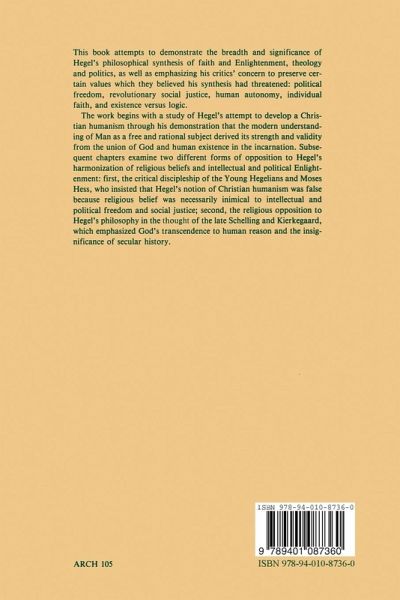 This study is an attempt to examine the relationships between religious belief and the humanism of the Enlightenment in the philosophy of Hegel and of a group of thinkers who related to his thought in various ways during the 1840's. It begins with a study of the ways in which Hegel attempted to evolve a genuinely Christian humanism by his demonstration that the modern understanding of man as a free and rational subject derived its strength and validity from the union of God and human existence in the incarnation. The rest of this study is con cerned with two different forms of opposition to Hegel: first, the criti cal discipleship of the Young Hegelians and Moses Hess, who insisted that Hegel's notion of Christian humanism was false because religious belief was necessarily inimical to a clear consciousness of social evil and the determination to abolish it; second, the religious opposition to the Enlightenment in the thought of Schelling and Kierkegaard, which emphasized God's transcendence to human reason and the insig nificance of secular history. In the years leading up to the revolution of 1848, Hegel's synthesis was rejected in favour of the assertion of atheistic humanism or religious otherworldliness. Chapter One, after discussing the young Hegel's critique of the social and political effects of Christianity, examines the union of religi ous belief, speculative philosophy and the rational state in Hegel's mature system.