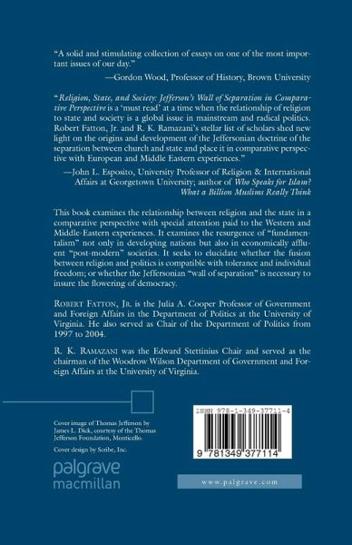 "Religion, State and Society: Jefferson's Wall of Separation in Comparative Perspective is a 'must read' at a time when the relationship of religion to state and society is a global issue in mainstream and radical politics. Robert Fatton Jr. and R. K. Ramazani's stellar list of scholars shed new light on the origins and development of the Jeffersonian doctrine of the separation between church and state and place it in comparative perspective with European and Middle Eastern experiences. " - John L. Esposito is University Professor of Religion & International Affairs at Georgetown University; his most recent book is Who Speaks for Islam? What a Billion Muslims Really Think.