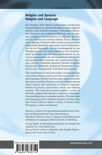 Die Beiträge dieses Buches untersuchen verschiedene Fragestellungen zu religiösen Bezügen in nicht-religiöser Sprache, etwa in Redewendungen, Ortsnamen, Ökonomie-Diskursen oder politischer Rhetorik, und zu nicht-(nur-)religiösen Konstruktionen in religiöser Sprache, etwa in Gebeten und anderen sakralen Texten, Ritualen oder religiösen Traktaten. Dabei werden unterschiedliche linguistische Methoden angewandt, von der Diskursanalyse bis zur Onomastik, von der Soziolinguistik bis zur Metaphernanalyse. In vielen Aufsätzen wird interdisziplinär gearbeitet, etwa mit Input aus Bereichen wie der Literaturwissenschaft oder der Geschichtsforschung. Die untersuchten Daten stammen aus verschiedenen Sprachen, darunter Aramäisch, Bosnisch, Deutsch, Englisch, Französisch, Hebräisch, Italienisch, Katalanisch, Kroatisch, Latein, Portugiesisch, Sefardisch und Spanisch.