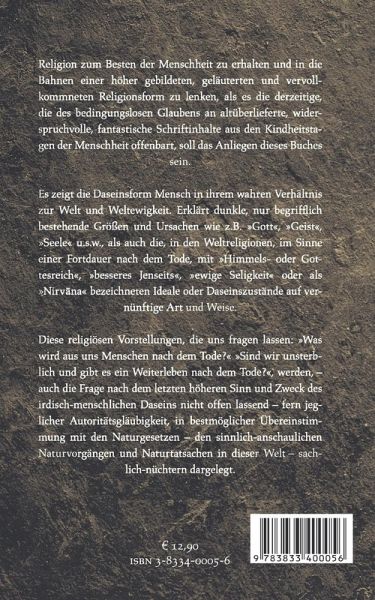 Unter dem Leitsatz :"Nicht gläubige sondern wissende Menschen sollten wir sein", werden im vorliegendem Buche die heute noch bestehenden tiefen Gegensätze zwischen der Religion und den Naturwissenschaften aufgehoben, mit dem Ziel, der blindvertrauenden menschlichen Gläubigkeit in religiösen Fragen, metaphysischen Vorstellungen über Wesen und Dinge, durch klare Erkenntnisse, die mit sicheren Erfahrungen im sinnlich-anschaulichen Weltteil widerspruchslos übereinstimmen, sich also auf Wahrheit gründen- zumindest als wahrscheinlich entgegenzuwirken und dadurch einer weiter- oder höherentwickelten Form religiösem Denkens, die als wahre Religion bezeichnet werden kann, die Bahn zu brechen. Nur wahre Religion, geboren aus umfassender Wahrheitserkenntnis und Vernunft, kann die M a t e r i e f o r m Men s c h dahin bringen, ihr Schicksal in der Weltewigkeit und -unendlichkeit nicht mehr dem blinden Zufall, nicht mehr unbekannten Göttern zu überlassen, sondern sie versucht den menschlichen Willen anzuspornen sein Schicksal irgendwie selbst zu meistern und zu bestimmen, wie es mit zu dem Grundgedanken in der buddhistischen Religion, der Lehre des Buddha gehört.