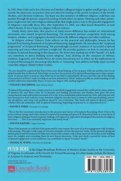 In 1992, Peter Ochs and a few Christian and Muslim colleagues began to gather small groups, in and outside the classroom, to practice close and attentive reading of the sacred Scriptures of the Jewish, Muslim, and Christian traditions. The hope was that members of different religions could hear one another through the patient, respectful reading of each other's Scripture. Hearing each other, participants might enter into interreligious relationships that might point a way to the peaceful engagement of religions--especially those who, after September 11, 2001, too often found themselves at each other's throats. It was a hope for religion without violence. Nearly thirty years later, this practice of study-across-difference has seeded an international movement, now named Scriptural Reasoning. The movement nurtures cooperative study among students, scholars, and congregants devoted to distinctly different religious and value traditions. In Religion without Violence, Ochs reflects on the practical and philosophic lessons he has learned from hosting hundreds of Scriptural Reasoning engagements. He introduces the ""scriptural pragmatism"" of Scriptural Reasoning."" He painstakingly recounts instances of successful scriptural reasoning and warns where and how it might fail. He provides guidance on how to introduce and facilitate Scriptural Reasoning in the classroom. He shows how reading out of the ""hearth"" of a faith can contribute to peace building across religions. And, drawing on the resources of rabbinic tradition, Augustine, and Charles Peirce, he moves beyond practice to reflect on the implications of Scriptural Reasoning for discerning what kinds of ""reasoning"" best address and help repair societal crises like religion-related violent conflict.