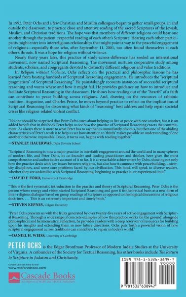 In 1992, Peter Ochs and a few Christian and Muslim colleagues began to gather small groups, in and outside the classroom, to practice close and attentive reading of the sacred Scriptures of the Jewish, Muslim, and Christian traditions. The hope was that members of different religions could hear one another through the patient, respectful reading of each other's Scripture. Hearing each other, participants might enter into interreligious relationships that might point a way to the peaceful engagement of religions--especially those who, after September 11, 2001, too often found themselves at each other's throats. It was a hope for religion without violence. Nearly thirty years later, this practice of study-across-difference has seeded an international movement, now named Scriptural Reasoning. The movement nurtures cooperative study among students, scholars, and congregants devoted to distinctly different religious and value traditions. In Religion without Violence, Ochs reflects on the practical and philosophic lessons he has learned from hosting hundreds of Scriptural Reasoning engagements. He introduces the ""scriptural pragmatism"" of Scriptural Reasoning."" He painstakingly recounts instances of successful scriptural reasoning and warns where and how it might fail. He provides guidance on how to introduce and facilitate Scriptural Reasoning in the classroom. He shows how reading out of the ""hearth"" of a faith can contribute to peace building across religions. And, drawing on the resources of rabbinic tradition, Augustine, and Charles Peirce, he moves beyond practice to reflect on the implications of Scriptural Reasoning for discerning what kinds of ""reasoning"" best address and help repair societal crises like religion-related violent conflict.