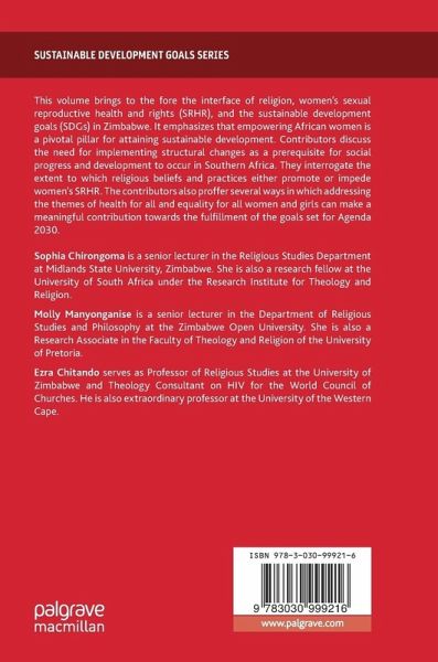 This volume brings to the fore the interface of religion, women's sexual reproductive health and rights (SRHR), and the sustainable development goals (SDGs) in Zimbabwe. It emphasizes that empowering African women is a pivotal pillar for attaining sustainable development. Contributors discuss the need for implementing structural changes as a prerequisite for social progress and development to occur in Southern Africa. They interrogate the extent to which religious beliefs and practices either promote or impede women's SRHR. The contributors also proffer several ways in which addressing the themes of health for all and equality for all women and girls can make a meaningful contribution towards the fulfillment of the goals set for Agenda 2030.