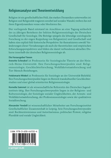Annette Schnabel ist Professorin für Soziologische Theorie an der Heinrich-Heine-Universität. Ihre Forschungsschwerpunkte sind: Religionssoziologie, Geschlechterforschung, Wohlfahrtsstaatsforschung und Tier-Mensch-Beziehungen. Heidemarie Winkel ist Professorin für Soziologie an der Universität Bielefeld. Ihre Forschungsschwerpunkte liegen im Bereich transkultureller Geschlechterstudien und einer global orientierten Religionssoziologie. Kornelia Sammet ist als wissenschaftliche Referentin des Deutschen Jugendinstituts tätig. Ihre Forschungsschwerpunkte liegen in der Religions- und Kultursoziologie, der Soziologie sozialer Ungleichheiten, der Armuts- und Wohlfahrtsstaatsforschung, der Professionssoziologie sowie der qualitativen Sozialforschung. Alexander Yendell ist wissenschaftlicher Mitarbeiter am Forschungsinstitut Gesellschaftlicher Zusammenhalt in Leipzig. Sein Forschungsschwerpunkte sind: Rechtsextremismus und Autoritarismus, politischer Protest, religiöse Pluralität und soziale Ungleichheit.