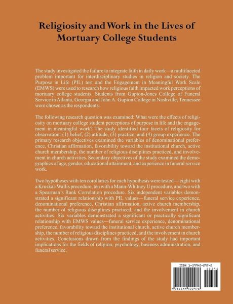 The study investigated the failure to integrate faith in daily work--a multifaceted problem important for interdisciplinary studies in religion and society. The Purpose in Life (PIL) test and the Engagement in Meaningful Work Scale (EMWS) were used to research how religious faith impacted work perceptions of mortuary college students. Students from Gupton-Jones College of Funeral Service in Atlanta, Georgia and John A. Gupton College in Nashville, Tennessee were chosen as the respondents. The following research question was examined: What were the effects of religiosity on mortuary college student perceptions of purpose in life and the engagement in meaningful work? The study identified four facets of religiosity for observation: (1) belief, (2) attitude, (3) practice, and (4) group experience. The primary research objectives examined the variables of denominational preference, Christian affirmation, favorability toward the institutional church, active church membership, the number of religious disciplines practiced, and involvement in church activities. Secondary objectives of the study examined the demographics of age, gender, educational attainment, and experience in funeral service work. Two hypotheses with ten corollaries for each hypothesis were tested-- eight with a Kruskal-Wallis procedure, ten with a Mann-Whitney U procedure, and two with a Spearman's Rank Correlation procedure. Six independent variables demonstrated a significant relationship with PIL values--funeral service experience, denominational preference, Christian affirmation, active church membership, the number of religious disciplines practiced, and the involvement in church activities. Six variables demonstrated a significant or practically significant relationship with EMWS values--funeral service experience, denominational preference, favorability toward the institutional church, active church membership, the number of religious disciplines practiced, and the involvement in church activities. Conclusions drawn from the findings of the study had important implications for the fields of religion, psychology, business administration, and funeral service.