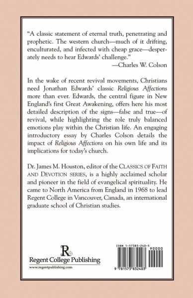 In the wake of recent revival movements, Christians need Jonathan Edwards' classic Religious Affections more than ever. Edwards, the central figure in New England's first Great Awakening, offers here his most detailed description of the signs-false and true-of revival, while highlighting the role truly balanced emotions play within the Christian life. An engaging introductory essay by Charles Colson details the impact of Religious Affections on his own life and its implications for today's church.