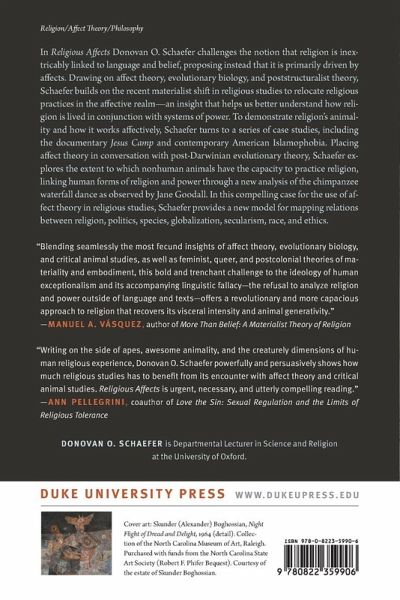 Making a case for the use of affect theory in religious studies, Donovan O. Schaefer challenges the notion that religion is inextricably linked to language and cognition, contending instead that religion is primarily driven by affect and that non-human animals have the capacity to practice religion.