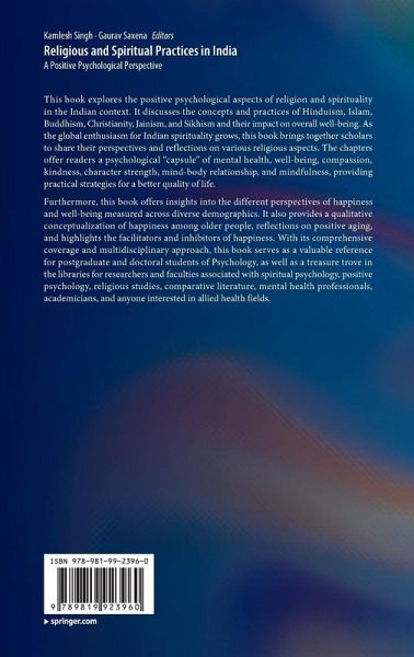This book explores the positive psychological aspects of religion and spirituality in the Indian context. It discusses the concepts and practices of Hinduism, Islam, Buddhism, Christianity, Jainism, and Sikhism and their impact on overall well-being. As the global enthusiasm for Indian spirituality grows, this book brings together scholars to share their perspectives and reflections on various religious aspects. The chapters offer readers a psychological "capsule" of mental health, well-being, compassion, kindness, character strength, mind-body relationship, and mindfulness, providing practical strategies for a better quality of life. Furthermore, this book offers insights into the different perspectives of happiness and well-being measured across diverse demographics. It also provides a qualitative conceptualization of happiness among older people, reflections on positive aging, and highlights the facilitators and inhibitors of happiness. With its comprehensive coverage and multidisciplinary approach, this book serves as a valuable reference for postgraduate and doctoral students of Psychology, as well as a treasure trove in the libraries for researchers and faculties associated with spiritual psychology, positive psychology, religious studies, comparative literature, mental health professionals, academicians, and anyone interested in allied health fields.