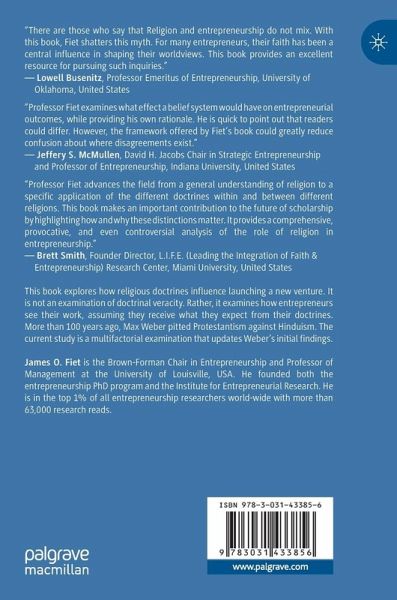 This book explores how religious doctrines influence launching a new venture. It examines 16 Christian denominations and 9 world religions and how they would reasonably be expected to apply more than 20 distinct doctrines each to entrepreneurship. It is not an examination of doctrinal veracity because adherents have confidence in their beliefs. Rather, it examines how they will evaluate the attractiveness of entrepreneurship through the lenses of their beliefs, assuming they receive what they expect. More than 100 years ago, Max Weber pitted Protestantism against Hinduism in a single hypothesis. The current study is a multifactorial examination that covers the world's major religions, as well as most of their doctrines. It is the first comprehensive examination of how entrepreneurs view the world through the lenses of their religious doctrines, which represent the formalization of their most deeply held beliefs.