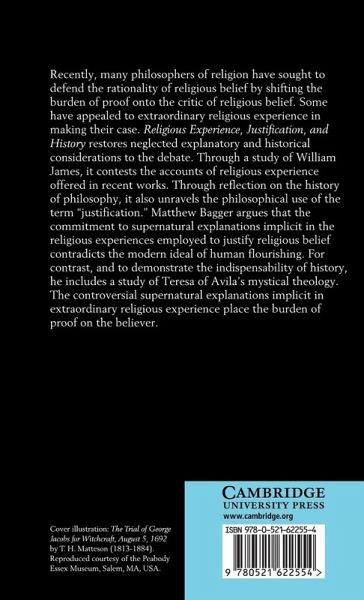 Many philosophers of religion have sought to defend the rationality of religious belief by shifting the burden of proof onto the critic of religious belief. Some have appealed to extraordinary religious experience in making their case. Religious Experience, Justification and History restores neglected explanatory and historical considerations to the debate. Through a study of William James, it contests the accounts of religious experience offered in recent works. Through reflection on the history of philosophy, it also unravels the philosophical use of the term 'justification'. Matthew Bagger argues that the commitment to supernatural explanations implicit in the religious experiences employed to justify religious belief contradicts the modern ideal of human flourishing. For contrast, and to demonstrated the indispensability of history, he includes a study of Teresa of Avila's mystical theology. The controversial supernatural explanations implicit in extraordinary religious experience places the burden of proof on the believer.
