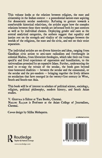 This book looks at the triadic relations between faith, the state and political actors, and the ideas that move them. It comprises a set of essays on diverse histories and ideas, ranging from Gandhian civic action to radical free thought in colonial India, from liberation theologies, that take their cue from specific and lived experiences of oppression and humiliation, to the universalism promised by an expansive Islam. Deploying gender and caste as the central analytical categories, these essays suggest that equality and justice rest on the strength and vitality of the exchanges between the worlds of the civic, the religious and the state, and not on their strict separation. Going beyond time-honoured dualities - between the secular and the communal (especially in the Indian context), or the secular and the pre-modern - the book joins the lively debates on secularism that have emerged in the 21st century in West, South and South-east Asia.¿