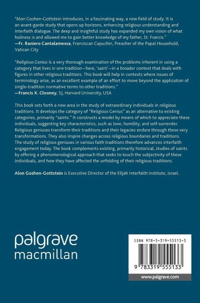 This book sets forth a new area in the study of extraordinary individuals in religious traditions. It develops the category of "Religious Genius" as an alternative to existing categories, primarily "saint." It constructs a model by which to appreciate these individuals, suggesting key characteristics such as love, humility, and self-surrender. Religious geniuses transform their traditions and their legacies endure through these very transformations. They also inspire changes across religious boundaries and traditions. The study of religious geniuses in various faith traditions therefore advances interfaith engagement today. The book complements existing, primarily historical, studies of saints by offering a phenomenological approach that seeks to touch the subjectivity of these individuals, and how they have affected the unfolding of their religious traditions.