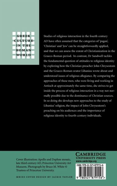 Studies of religious interaction in the fourth century AD have often assumed that the categories of 'pagan', 'Christian' and 'Jew' can be straightforwardly applied, and that we can assess the extent of Christianization in the Graeco-Roman period. In contrast, Dr Sandwell tackles the fundamental question of attitudes to religious identity by exploring how the Christian preacher John Chrysostom and the Graeco-Roman orator Libanius wrote about and understood issues of religious allegiance. By comparing the approaches of these men, who were living and working in Antioch at approximately the same time, she strives to get inside the process of religious interaction in a way not normally possible due to the dominance of Christian sources. In so doing she develops new approaches to the study of Libanius' religion, the impact of John Chrysostom's preaching on his audiences and the importance of religious identity to fourth-century individuals.