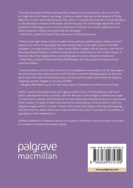 Ashley Crawford investigates how such figures as Ben Marcus, Matthew Barney, and David Lynch-among other artists, novelists, and film directors-utilize religious themes and images via Christianity, Judaism, and Mormonism to form essentially mutated variations of mainstream belief systems. He seeks to determine what drives contemporary artists to deliver implicitly religious imagery within a 'secular' context. Particularly, how religious heritage and language, and the mutations within those, have impacted American culture to partake in an aesthetic of apocalyptism that underwrites it.