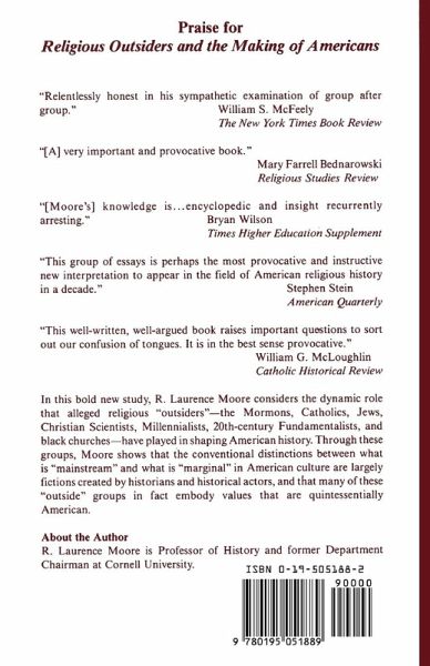 Throughout history, the reality of America's diverse religious life has continually been subordinated to the themes of Protestant unity and dominance. At the centre of this study are seven religious groups that are usually accorded a secondary influence on American culture: the Mormons, Catholics, Jews, Christian Scientists, Millennialists, 20th-century Protestant Fundamentalists, and the black churches. Through these groups Moore boldly shows that the conventional distinctions between what is "mainstream" and what is "marginal" in American culture are largely strategical fictions created by historians and historical actors, and that many of these "outside" groups in fact embody values that are quintessentially American. The book also examines the part that religious persecution has played in American history, and the ways in which religious groups have often turned persecution to their own advantage. The author's analysis of pluralism provides a solid and important new context for viewing America's religious past and also builds a solid historical perspective for understanding the religious cults and sects that are receiving so much attention in American life today. This is a paperback reissue of the hardback first published in 1986.