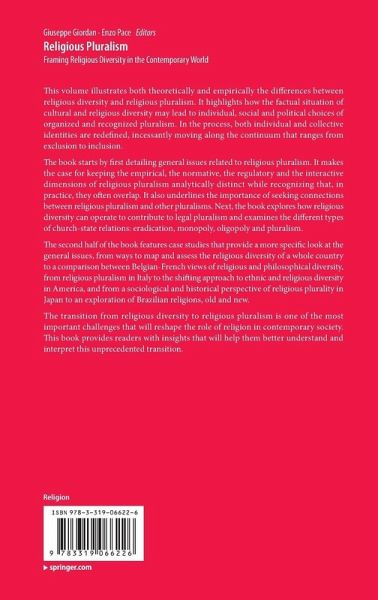 Chapter 1: Introduction: Pluralism as Legitimization of Diversity; Giuseppe Giordan.- PART I: IDEAS AND CONCEPTS ON RELIGIOUS PLURALISM.- Chapter 2: Rethinking Religious Pluralism; James A. Beckford.- Chapter 3: Religious Diversity, Social Control and Legal Pluralism: A Socio-Legal Analysis; James T. Richardson.- Chapter 4: Oligopoly Is Not Pluralism; Fenggang Yang.- PART II: CASE STUDIES IN RELIGIOUS PLURALISM.- Chapter 5 : Religious and Philosophical Diversity as a Challenge for the Secularism: A Belgian-French Comparison; Jean-Paul Willaime.- Chapter 6: The Diversity of Religious Diversity. Using Census and NCS Methodology in Order to Map and Assess the Religious Diversity of a Whole Country; Christophe Monnot and Jörg Stolz.- Chapter 7: Increasing Religious Diversity in a Society Monopolized by Catholicism; Vincenzo Pace.- Chapter 8: Rethinking Religious Diversity: Diversities and Governance of Diversities in "Post-Societies"; Sinisa Zrinscak.- Chapter 9: Diversity vs Pluralism? Notes from the American Experience; James V. Spickard.- Chapter 10: Between No Establishment and Free Exercise: The Dialectic of American Religious Pluralism; William H. Swatos, Jr.- Chapter 11: Missionary Trans-border Religions and Defensive Civil Society in Contemporary Japan: Toward a Comparative Institutional Approach to Religious Pluralism; Yoshihide Sakurai.- Chapter 12: Religious Tendencies in Brazil: Disenchantment, Secularization and Sociologists; Roberto Motta.- Index.