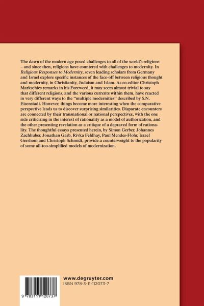 As co-editor Christoph Markschies remarks in his Foreword, it may seem almost trivial to say that different religions, and the various currents within them, have reacted in very different ways to the "multiple modernities" described by S.N. Eisenstadt. However, things become more interesting when the comparative perspective leads us to discover surprising similarities. Disparate encounters are connected by their transnational or national perspectives, with the one side criticizing in the interest of rationality as a model of authorization, and the other presenting revelation as a critique of a depraved form of rationality. The thoughtful essays presented herein, by Simon Gerber, Johannes Zachhuber, Jonathan Garb, Rivka Feldhay, Paul Mendes-Flohr, Israel Gershoni and Christoph Schmidt, provide a counterweight to the popularity of some all-too-simplified models of modernization.
