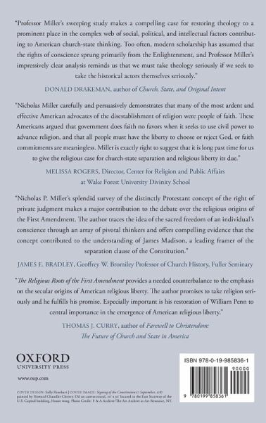 Traditional understandings of the genesis of the separation of church and state rest on assumptions about 'Enlightenment' and the republican ethos of citizenship. Nicholas Miller does not seek to dislodge that interpretation but to augment and enrich it by recovering its cultural and discursive religious contexts - specifically the discourse of Protestant dissent. He argues that commitments by certain dissenting Protestants to the right of private judgment in matters of Biblical interpretation, an outgrowth of the doctrine of the priesthood of all believers, helped promote religious disestablishment in the early modern West. This movement climaxed in the disestablishment of religion in the early American colonies and nation. Miller identifies a continuous strand of this religious thought from the Protestant Reformation, across Europe, through the English Reformation, Civil War, and Restoration, into the American colonies. He examines seven key thinkers who played a major role in the development of this religious trajectory as it came to fruition in American political and legal history: William Penn, John Locke, Elisha Williams, Isaac Backus, William Livingston, John Witherspoon, and James Madison. Miller shows that the separation of church and state can be read, most persuasively, as the triumph of a particular strand of Protestant nonconformity - that which stretched back to the Puritan separatist and the Restoration sects, rather than to those, like Presbyterians, who sought to replace the 'wrong' church establishment with their own, 'right' one. The Religious Roots of the First Amendment contributes powerfully to the current trend among some historians to rescue the eighteenth-century clergymen and religious controversialists from the enormous condescension of posterity.