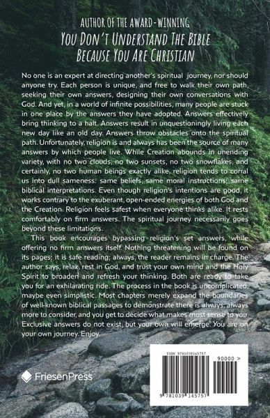 No one is an expert at directing another's spiritual journey, nor should anyone try. Each person is unique, and free to walk their own path, seeking their own answers, designing their own conversations with God. And yet, in a world of infinite possibilities, many people are stuck in one place by the answers they have adopted. Answers effectively bring thinking to a halt. Answers result in unquestioningly living each new day like an old day. Answers throw obstacles onto the spiritual path. Unfortunately, religion is and always has been the source of many answers by which people live. While Creation abounds in unending variety, with no two clouds, no two sunsets, no two snowflakes, and certainly, no two human beings exactly alike, religion tends to corral us into dull sameness: same beliefs, same moral instructions; same biblical interpretations. Even though religion's intentions are good, it works contrary to the exuberant, open-ended energies of both God and the Creation. Religion feels safest when everyone thinks alike. It rests comfortably on firm answers. The spiritual journey necessarily goes beyond these limitations. This book encourages bypassing religion's set answers, while offering no firm answers itself. Nothing threatening will be found on its pages; it is safe reading; always, the reader remains in charge. The author says, relax, rest in God, and trust your own mind and the Holy Spirit to broaden and refresh your thinking. Both are ready to take you for an exhilarating ride. The process in the book is uncomplicated, maybe even simplistic. Most chapters merely expand the boundaries of well-known biblical passages to demonstrate there is always, always more to consider, and you get to decide what makes most sense to you. Exclusive answers do not exist, but your own will emerge. You are on your own journey. Enjoy.