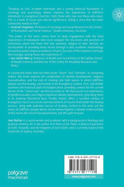 In a polarised milieu that too often posits "queer" and "Christian" as competing realms, this book explores the complexities of identity development, religious traumatisation, and the task of creating safe faith spaces in which LGBTQA+ people can find healing, particularly in the Evangelical context. First, Joel Hollier examines the historical path of Evangelicalism, providing context for the current terrain of the "culture war" we find ourselves in. He then parses out experiences of gender/sexuality and religious/spiritual identity development, grounding them in an evolving theoretical base. Finally, Hollier offers a rounded critique of Evangelical church structures and mechanisms of trauma that hinder the healing process, along with potential sources of healing. Central to this work are the voices of LGBTQA+ people whose stories weave together a deeper understanding of the harms the Church has perpetrated, and the path forward.