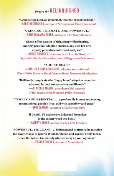 WINNER, THE 2026 ADELE CLARK BOOK AWARD FINALIST, NONFICTION, NATIONAL BOOK CRITICS CIRCLE AWARDS, 2024 FINALIST, 2024 GODDARD RIVERSIDE STEPHAN RUSSO BOOK PRIZE FOR SOCIAL JUSTICE "Essential reading." -NPR "Books We Love" "Dares to imagine a different world where Americans treat adoption like the justice issue it is." -Washington Post "Impressively reported...[Sisson] uses her deep well of knowledge to make the case that adoption is no solution for Americans' reduced access to abortion." -San Francisco Chronicle A powerful decade-long study of adoption in the age of Roe, revealing the grief of the American mothers for whom the choice to parent was never real Adoption has always been viewed as a beloved institution for building families, as well as a mutually agreeable common ground in the abortion debate, but little attention has been paid to the lives of mothers who relinquish infants for private adoption. Relinquished reveals adoption to be a path of constrained choice for those for whom abortion is inaccessible, or for whom parenthood is untenable. The stories of relinquishing mothers are stories about our country's refusal to care for families at the most basic level, and to instead embrace an individual, private solution to a large-scale, social problem. With the recent decision in Dobbs v. Jackson Women's Health Organization revoking abortion protections, we are in a political moment in which adoption is, increasingly, being revealed as an institution devoted to separating families and policing parenthood under the guise of feel-good family-building. Rooted in a long-term study, Relinquished features the in-depth testimonies of American mothers who placed their children for domestic adoption. The voices of these women are powerful and heartrending; they deserve to be heard.