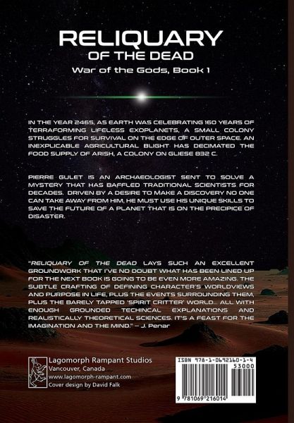 Winner of six literary awards, including the top award at the 2025 Halloween Book Festival. Pierre Gulet, an eccentric and uniquely intuitive French archaeologist, is living in 25th century Egypt but is fixated on the past. After centuries, Egypt is still Egypt-the pyramids, the donkey carts, the unfinished high rises, the rancid stench of garbage, the systemic corruption. Pierre was excavating the find of a lifetime, a pre-dynastic temple beneath an Old Kingdom fortress, until he was called into the office of the Director of Antiquities who takes away his life's work, blacklists him, and drives him into exile onto a distant world, a small colony struggling for survival on the edge of outer space. Pierre must now solve a mystery that has baffled traditional scientists for decades, an agricultural blight that has decimated the food supply of a colony on Gliese 832 c. Driven by a desire to make a discovery no one can take away from him, he must use his unique skills to save the future of a planet that is on the precipice of disaster. But as he seeks to uncover the truth, he is opposed by intransigent colonists, jealous predecessors, and an ancient power lurking deep in the earth. The more he discovers, the more he is vilified, and the more determined he becomes to discover what is at the heart of the blight. Should he fail, everyone in the colony dies. RELIQUARY OF THE DEAD is the first book in the WAR OF THE GODS series, inspired by Sherlock Holmes, Indiana Jones, and the cosmic mythos of the ancient Near East.