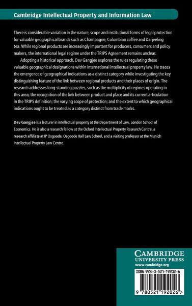 There is considerable variation in the nature, scope and institutional forms of legal protection for valuable geographical brands such as Champagne, Colombian coffee and Darjeeling tea. While regional products are increasingly important for producers, consumers and policy makers, the international legal regime under the TRIPS Agreement remains unclear. Adopting a historical approach, Dev Gangjee explores the rules regulating these valuable geographical designations within international intellectual property law. He traces the emergence of geographical indications as a distinct category while investigating the key distinguishing feature of the link between regional products and their places of origin. The research addresses long-standing puzzles, such as the multiplicity of regimes operating in this area; the recognition of the link between product and place and its current articulation in the TRIPS definition; the varying scope of protection; and the extent to which geographical indications ought to be treated as a category distinct from trade marks.