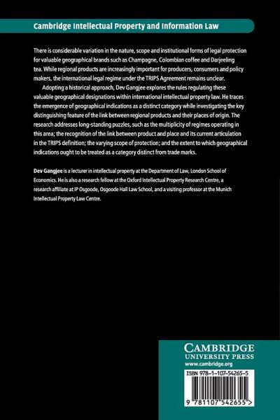 There is considerable variation in the nature, scope and institutional forms of legal protection for valuable geographical brands such as Champagne, Colombian coffee and Darjeeling tea. While regional products are increasingly important for producers, consumers and policy makers, the international legal regime under the TRIPS Agreement remains unclear. Adopting a historical approach, Dev Gangjee explores the rules regulating these valuable geographical designations within international intellectual property law. He traces the emergence of geographical indications as a distinct category while investigating the key distinguishing feature of the link between regional products and their places of origin. The research addresses long-standing puzzles, such as the multiplicity of regimes operating in this area; the recognition of the link between product and place and its current articulation in the TRIPS definition; the varying scope of protection; and the extent to which geographical indications ought to be treated as a category distinct from trade marks.